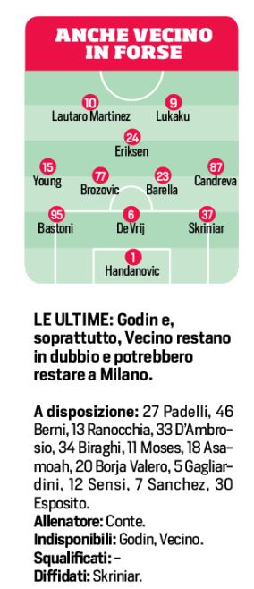 Se Gattuso è in ansia per Mertens, Allan e Fabian Ruiz, anche Antonio Conte certo non può avere il volto della felicità, anzi anche lui ha le sue grane. Ormai è certo di non poter contare su Vecino a centrocampo, giocatore forte nel gioco aereo e sa destreggiarsi fisicamente, ma anche la difesa ha diversi acciacchi. In forte dubbio Godin, ieri si è allenato, ma è a rischio convocazione. Anche De Vrij e Bastoni non sono al 100%, non si sa se il tecnico dei nerazzurri li rischierà entrambi o rinunciare uno dei due per dar spazio a Ranocchia. In avanti Eriksen dovrebbe spuntarla su Sensi dietro Lukaku e Lautaro Martinez, infine sulle fasce Young e Candreva, favoriti su Biraghi e Moses.