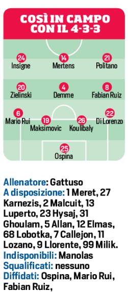 La sfida con l’Inter è già difficile per il valore dell’avversario e disputare la sfida a porte chiuse, ma per il tecnico del Napoli Gennaro Gattuso lo è ancora di più per la situazione infortuni. L’allenatore di Coregliano Calabro è in ansia per le condizioni di Allan, Fabian Ruiz e Mertens. Il belga è quello che preoccupa di più, affaticamento muscolare e non averlo in campo sarebbe una dura botta per i partenopei. Lo staff medico proverà a recuperarlo, ma se non ci dovesse essere, c’è Milik. Anche i due centrocampisti non sono al top della condizione. Per il resto un solo ballottaggio quello tra Callejon e Politano con l’ex nerazzurro in leggero vantaggio sullo spagnolo. Gattuso però tifa per lo staff medico e che gli consegna al top i suoi tre affaticati.