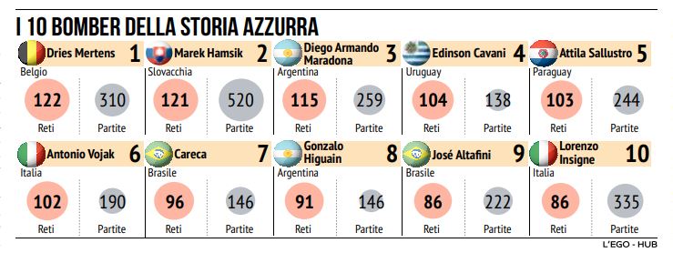 L’unico che può insidiare Mertens è Lorenzo Insigne che però di gol ne ha fatti “solo” 86 (ed è decimo nella classifica dei marcatori azzurri) mentre l’altro è Callejon (11esimo con 80 gol) che però è destinato questa estate al ritorno in Spagna.