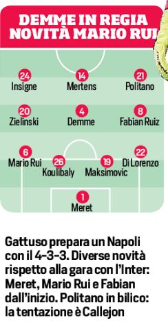 Il Napoli da ieri ha ripreso gli allenamenti, in vista della finale di Coppa Italia di mercoledì contro la Juventus, fischio d’inizio alle ore 21,00. Rispetto alla sfida contro i nerazzurri possibili tre cambi di formazione. Una obbligata, Meret per lo squalificato Ospina, Mario Rui per Hysaj a sinistra e infine Fabian Ruiz per Demme. Ballottaggio in avanti Politano per Callejon, con l’ex Inter e Sassuolo avanti sullo spagnolo.