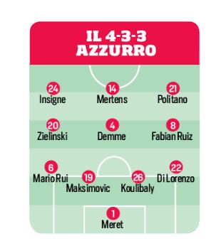 A disposizione: 27 Karnezis, 16 Idasiak, 2 Malcuit, 13 Luperto, 23 Hysaj, 31 Ghoulam, 5 Allan, 12 Elmas, 7 Callejon, 11 Lozano, 9 Llorente, 99 Milik.