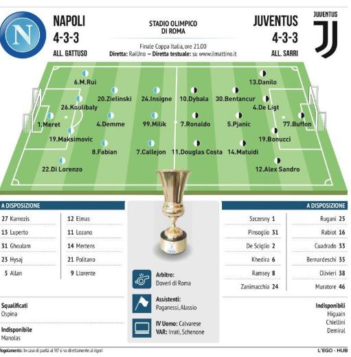 Nell’allenamento al San Paolo di ieri Gattuso ha mostrato di non aver ancora messo ogni tassello al suo posto. Il vero dubbio è lì in attacco: Milik e Mertens si sono alternati per tutto il tempo là davanti, in una staffetta che rende omaggio – oggi saranno esattamente 50 anni da Italia-Germania Ovest 4-3 – alla più storica delle alternanze, quella tra Mazzola e Rivera. Chi giocherà dall’inizio? L’impressione è che tocchi al polacco. E l’altra novità rispetto alla semifinale con l’Inter è il ritorno di Callejon dal primo minuto al posto di Politano. Ovvio, solo impressioni. Le certezze sono altre Fabian in mediana e Mario Rui terzino sinistro. Con Meret al posto di Ospina squalificato.