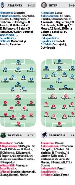 Serie A – Ore 19,30 Atalanta/Sassuolo e 21,45 Inter/Samp: le probabili formazioni e la classifica