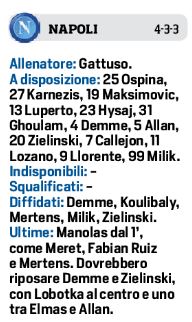 (Grafico) – Napoli/Spal, due novità a centrocampo, rientrano Meret e Manolas