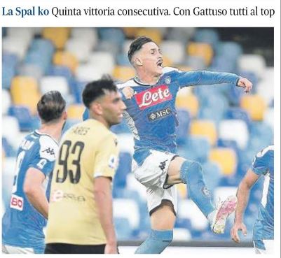 Il Napoli vince ancora, contro la Spal è il secondo successo consecutivo in campionato dopo la ripresa (il quinto tenendo presente i tre prima dello stop): ora è a meno tre dalla Roma, sconfitta dal Milan, mentre resta invariato il distacco dall’Atalanta, quarta in classifica, che ha vinto a Udine e conserva i dodici punti di vantaggio. Giovedì c’è lo scontro diretto a Bergamo, una partita decisiva per gli azzurri per provare ad accorciare e tenere viva la corsa Champions. I segnali della squadra di Gattuso in questa fase continuano ad essere confortanti sia dal punto di vista atletico che del gioco: molte le cose positive emerse contro la Spal e qualche difetto da correggere, come qualche occasione di troppo concessa alla formazione di Di Biagio. Un tris firmato da Mertens, Callejon e Younes, per la Spal a segno il neo azzurro Petagna. Fonte e foto: Il Mattino