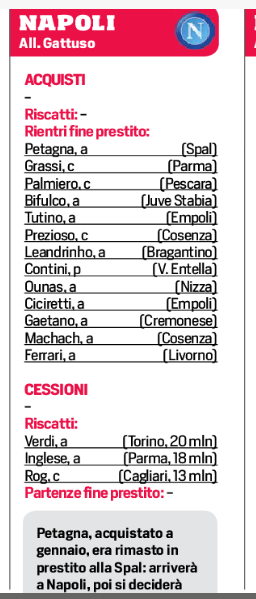 Tredici rientri per fine prestito tra giocatori con diritto e anche obbligo di riscatto. Nel secondo caso, il Napoli incasserebbe in tutto 51 milioni da immettere sul mercato. Ecco lo schema del CdS