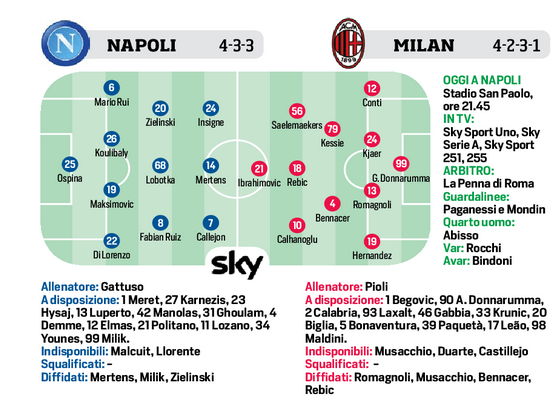 Questa sera alle ore 21,45 i giocherà allo stadio San Paolo, a porte chiuse, Napoli-Milan, sfida che in passato era per lo scudetto. Per Gattuso è una sfida speciale, occasione di un pronto riscatto, dopo l’esonero dello scorso anno. In porta in vantaggio Ospina su Meret, la mossa a sorpresa dovrebbe essere Lobotka in vantaggio su Demme. L’attacco composto da Callejon, Mertens e Insigne. In casa rossonera tutto sulle spalle di Ibrahimovic, alle sue spalle: Cahalanoglu, Rebic e Saelemkers.