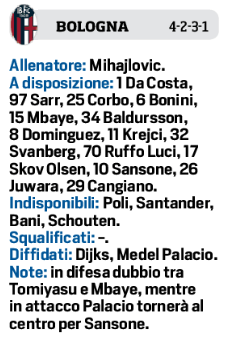 Domani sera alle ore 19,30 allo stadio “Dall’Ara”, il Bologna sfiderà il Napoli, per la trentaduesima giornata di campionato. I felsinei hanno voglia di dimenticare la rimonta subita contro il Parma e due i ballottaggi. In difesa M’Baye o Tomyasu, mentre in attacco Palacio dovrebbe spuntarla su Sansone. Per gli azzurri invece dal primo minuto: Meret in porta, Manolas in difesa, Hysay a sinistra, Elmas a centrocampo e Milik in attacco.