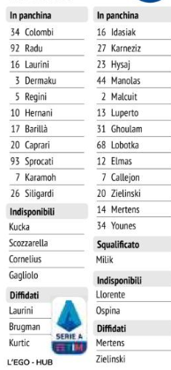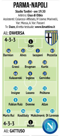Lozano centravanti a Parma, Ringhio Gattuso lo schiera stasera da prima punta. Milik è squalificato, Mertens fa parte dei convocati ma non è al meglio per la contusione al gluteo accusata nel match con l’Udinese e così toccherà al Chucky giocare in posizione centrale in attacco, ruolo già ricoperto con Ancelotti ma in un Napoli tatticamente diverso che giocava con il 4-4-2. Fonte e grafico Il Mattino