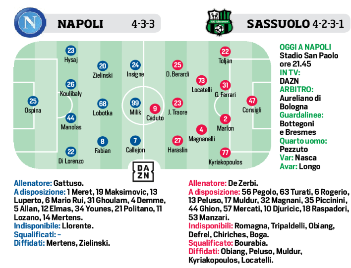Questa sera alle ore 21,45, allo stadio San Paolo, si giocherà un’interessante sfida tra il Napoli e il Sassuolo, per la terz’ultima giornata di campionato. Il tecnico degli azzurri Gattuso, potrà contare di nuovo su Ospina tra i pali, mentre in difesa uno tra Koulibaly, Manolas e Maksimovic in panchina, con Hysaj favorito sulla fascia sinistra. A centrocampo Lobotka per Demme, mentre Fabian e Zielinski ai lati. In attacco Callejon, Milik e Insigne, con Mertens ancora in panchina. Emergenza per De Zerbi che dovrà fare a meno tra gli altri di Boga e Chiriches. In avanti Caputo, Berardi, Traorè e Haraslim.