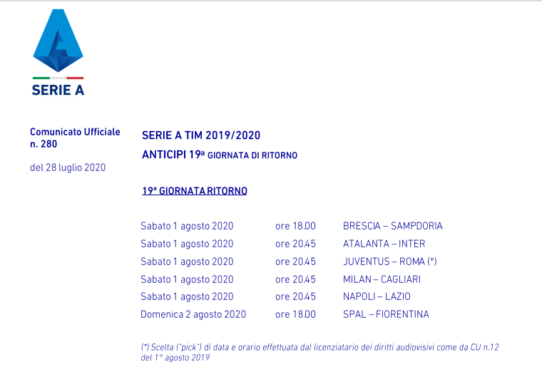 Inizialmente Napoli/Lazio era programmata per le 19,30. Gli azzurri chiuderanno al San Paolo sabato 1 Agosto alle 20,45