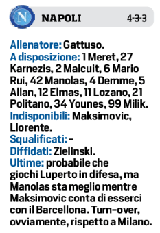 Per mister Gattuso in vista della sfida contro la Lazio, arrivano buone notizie dall’infermeria. Recupero di Manolas per la sfida contro i biancocelesti, ma forse parte dalla panchina, meglio anche Maksimovic ma forse non verrà rischiato. Al fianco di K2 ci sarà quindi Luperto, con Hysaj a sinistra e Di Lorenzo a destra. A centrocampo Fabian Ruiz, Lobotka e Zielinski. In attacco Callejon, Mertens e Insigne. Per la Lazio c’è un solo dubbio e riguarda il reparto offensivo, al fianco di Ciro Immobile, uno tra Correa e Caicedo, con il primo in vantaggio.