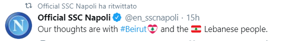 NewsCalcio SSC Napoli – “Vicini al popolo libanese” By Giuseppe Sacco il Ago 6, 2020 - 08:07:05 0 Condividi Così la SSC Napoli esprime la sua solidarietà a Beirut e tutto il Libano per l’immane tragedia Factory della Comunicazione LibanoNapolitwitter 0 Condividi FacebookTwitterGoogle+ReddItWhatsAppPinterestE-mail