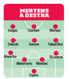 Il Napoli per ora è questo, forse, con uno dei due scugnizzi spostato a destra per far posto a Osimhen. Ma la stagione sarà lunga  e intensa e potrà esserci turnover e anche il 4-2-3-1. Ai lati della punta nigeriana ci sono al momento Insigne e Mertens, con Politano e Lozano pronti all’occorrenza. In attesa del mercato. Il resto ò la stessa formazione con l’aggiunta in difesa dell’ex Hellas Verona Rrahamani