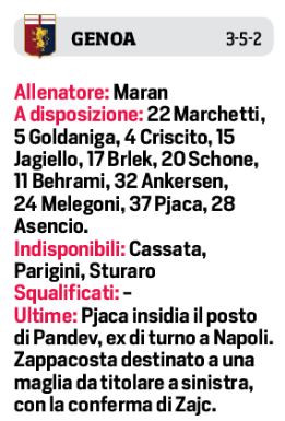 Domani alle ore 15,00 allo stadio San Paolo, aperto ai mille tifosi, il Napoli cerca i primi tre punti casalinghi, contro il Genoa di Maran. Per la sfida contro i liguri, possibile debutto dal primo minuto per Meret in porta e Lobotka a centrocampo. Ballottaggi per mister Gattuso, sulla sinistra Hysaj-Mario Rui e Mertens-Lozano, l’albanese e il belga in vantaggio sui rispettivi compagni di squadra. Infine Osimhen e Insigne a completare l’attacco. In casa rossoblù dubbio in attacco Pandev o Pjaca, con il croato che potrebbe spuntarla sull’ex della sfida.