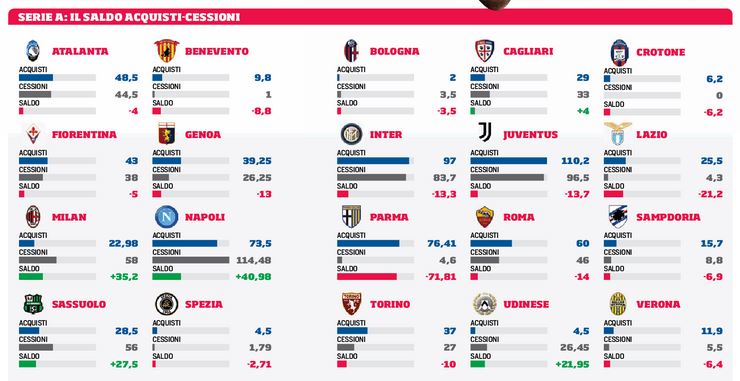 Il Napoli chiude con un +41 milioni, ed è la squadra in Serie A col saldo migliore. Infatti oltre agli azzurri solo Milan (+35), Sassuolo (+27), Udinese (+22) e Cagliari (+4) a chiudere col segno +. Tutto il resto della massima serie dovrà fare i conti con delle perdite. Gli azzurri guidano la classifica anche per quel che riguarda le cessioni (114 milioni), a chiudere il podio Juventus seconda con 96,5 milioni e Inter terza con 83,7 milioni.
