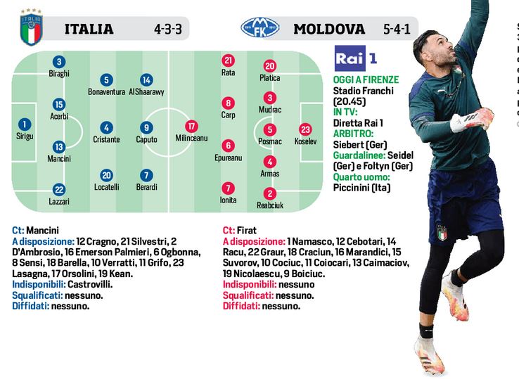Questa sera allo stadio “Franchi”, fischio d’inizio alle ore 20,45, l’Italia del c.t. Mancini giocherà contro la Moldavia, una sfida amichevole, per prepararsi al meglio contro l’Olanda e la Polonia. Mancheranno i giocatori del Napoli, ma anche Immobile e Belotti, tra vicenda tamponi ed esperimenti. In attacco il tridente El Shaarawy, Caputo e Berardi. Il duo dei centrali inedito Acerbi e Mancini, mentre a centrocampo Locatelli, Cristante e Bonaventura. La Moldavia in campo manderà il 5-4-1, difendersi per poi giocare di rimessa.