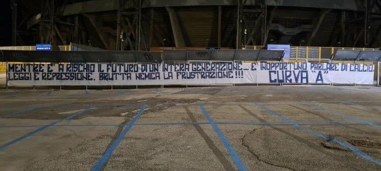 Lo striscione apparso ieri in serata all’esterno del San Paolo a firma degli ultras della curva A.