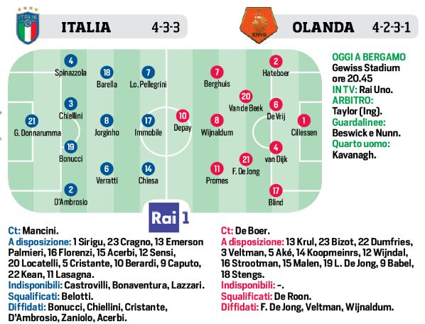 Questa sera al “Gewiss Stadium” di Bergamo, l’Italia affronterà l’Olanda per la quarta giornata della Nations League. In vista della sfida contro gli “orange” il c.t. Mancini rilancerà dal primo minuto Chiellini in difesa e Immobile in attacco. Per il ruolo di terzini D’Ambrosio e Spinazzola, con Donnarumma tra i pali. Per gli ospiti invece sarà sul 4-2-3-1 con Depay come centravanti.