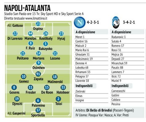 Tra qualche ora, sarà (finalmente) campo. E sarà 4-2-3-1 anche contro l’Atalanta. Gattuso continua sulla strada intrapresa e che intende portare avanti: in attacco conferma per la formula Mertens-Osimhen, con il belga un passo più indietro del centravanti nigeriano, Lozano verrà spostato a sinistra per le assenze in contemporanea di Insigne e Elmas, a destra giocherà Politano. Quindi, in attacco la novità iniziale sarà quella dell’ex interista che entrò bene in partita sia nel finale di Parma sfiorando il gol (gran parata di Sepe) che contro il Genoa quando riuscì a mettere a segno la sesta rete degli azzurri. Grande affidamento di Ringhio sulla super coppia Mertens-Osimhen, il belga, bomber azzurro di tutti i tempi, ha già segnato due reti, Osimhen proverà a sbloccarsi contro l’Atalanta dopo le due prestazioni molto positive con Parma e Genoa.