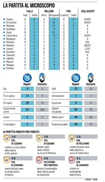 Coriandoli azzurri, stelle filanti, un Napoli spettacolare, devastante in attacco, impossibile per l’Atalanta le letture offensive di Gattuso, una varietà enorme di soluzioni nel 4-2-3-1 sempre più efficace non solo in fase avanzata ma anche difensiva. Superato a pieni voti l’esame contro la squadra di Gasperini, arrivata in testa a punteggio pieno dopo le prime tre giornate. (R. Ventre) Il Mattino