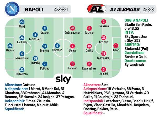 Questa sera alle ore 18,55 allo stadio San Paolo, esordio in campo europeo del Napoli contro l’Az Alkmaar, sfida valevole per la fase a gironi. Il tecnico degli azzurri Gattuso effettuerà due cambi: Maksimovic per Manolas e Lobotka al posto di Bakayoko. Per il resto quasi la stessa formazione che ha battuto l’Atalanta con il recupero di Insigne che partirà dalla panchina. La squadra olandese invece scenderà in campo con il 4-3-3, occhio al talento di Stengs e Karlsson.