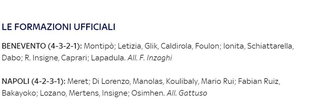 30′ – GOAL BENEVENTO – Lapadula mette in mezzo un pallone perfetto per Roberto Insigne che controlla davanti a Meret e insacca per l’1-0 sannita.