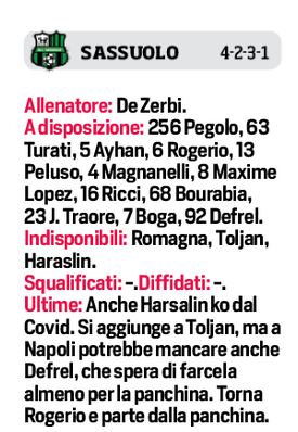 Il Napoli riprenderà quest’oggi gli allenamenti, in vista della sfida di domenica alle ore 18,00 allo stadio San Paolo contro il Sassuolo di De Zerbi. Per mister Gattuso si tornerà all’undici base con: Meret in porta, Di Lorenzo e Hysaj sugli esterni, mentre al centro di nuovo in campo Manolas. A centrocampo Bakayoko e Fabian Ruiz. Sulla trequarti, assente solo Insigne, oggi si conoscerà l’esito dell’infortunio, con Mertens e Osimhen in campo, rispetto a San Sebastian. Per i neroverdi invece tutto su Caputo, Berardi, Djuricic e il giovane classe 2000 Raspadori. In dubbio Defrel, mentre non ci saranno: Romagna, Toljan e Haraslim.