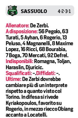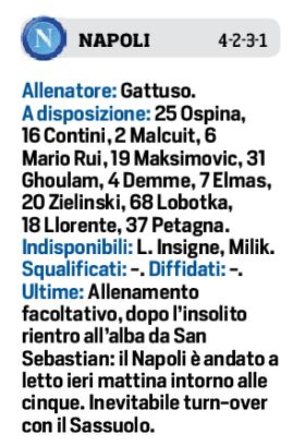 Domani alle ore 18,00 allo stadio San Paolo, il Napoli affronterà il Sassuolo, sfida valevole per la sesta giornata di campionato. Il tecnico degli azzurri Gennaro Gattuso schiererà dal primo minuto Meret tra i pali, Di Lorenzo a destra, al centro della difesa Koulibaly e di nuovo Manolas, mentre a sinistra spazio a Hysaj. I due del centrocampo Bakayoko e Fabian Ruiz. In attacco, in attesa di conoscere le condizioni di Insigne, spazio a Politano, Mertens, Lozano e Osimhen. Per i neroverdi c’è una tegola in attacco, non ci sarà al San Paolo Djuricic, al suo posto Traorè, con Raspadori e Berardi, dietro a Caputo. In difesa spazio all’ex della sfida Chiriches.