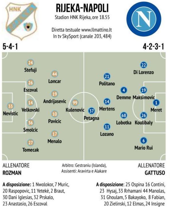 Ore 18,55 – Rijeka/Napoli: Gattuso ripropone il 4-2-3-1
