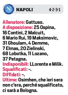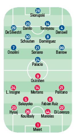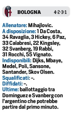 Domenica pomeriggio allo stadio “Dall’Ara”, fischio d’inizio alle ore 18,00, il Bologna affronterà il Napoli per la settima giornata di campionato. I felsinei dovranno fare a meno di: Dijks, Mbaye, Poli, Medel, Skov Olsen e Sansone per infortunio. In compenso Mihajlovic ha recuperato De Silvestri dalla botta di mercoledì. Ballottaggio a centrocampo tra Shouten e Dominguez, con l’argentino in vantaggio sull’olandese. In attacco spazio a Barrow, Palacio, Soriano e Orsolini. Per gli azzurri invece ritornano in campo dal primo minuto: Manolas, Hysaj, Bakayoko e Osimhen, assente ieri in Croazia per squalifica.