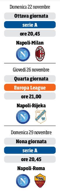 Siamo solo all’inizio di stagione per il Napoli, però dopo la sosta per le Nazionali, ci sarà un mini-ciclo a dir poco di fuoco. Domenica 22 Novembre alle ore 20,45 al San Paolo arriverà il Milan capolista di Ibrahimovic. A seguire il 26 Novembre alle ore 21,00, sempre in casa, il Rijeka per la quarta giornata di Europa League. Infine sempre tra le mura amiche la Roma, domenica 29 Novembre alle ore 20,45. Tre sfide importanti che diranno di più per il prosieguo del campionato e in campo internazionale.