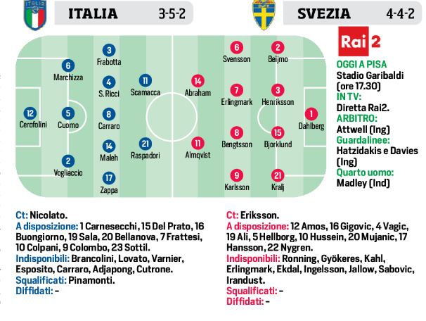 L’Italia cerca la ciliegina sulla torta. Gli azzurrini di Paolo Nicolato sono già qualificati alla seconda fase dell’Europeo Under 21, ma hanno un conto aperto con la Svezia che all’andata – al termine di una settimana in cui la nostra nazionale fece più tamponi che allenamenti – si impose a Kalmar con un netto 3-0. «Due mesi fa c’era una grande disparità nella condizione atletica – ha dichiarato il tecnico – stavolta speriamo di fare una gara diversa. Per loro è una partita da dentro o fuori, sono obbligati a vincere e avranno grandi motivazioni». Con l’Italia già sicura del primo posto nel girone 1, la Svezia spera – vincendo – di rientrare tra le 16 del qualificate come una delle migliori seconde.