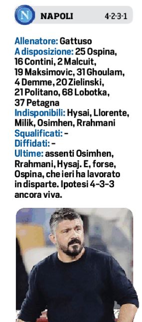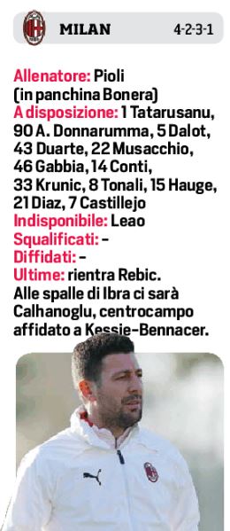 Domani sera allo stadio San Paolo, fischio d’inizio alle ore 20,45, il Napoli affronterà il Milan, big-match dell’ottava di campionato. Per mister Gattuso c’è il dubbio tra i pali: Meret o Ospina, con l’estremo difensore friulano in leggero vantaggio sul colombiano. Per il resto Osimhen non sarà della gara, visto che prosegue il suo lavoro in palestra, mentre Bakayoko cresce la fiducia nel vederlo in campo. In casa rossonera, il tecnico Bonera manderà in campo Rebic al posto di Rafael Leao, con Cahalanoglu, Salaemakers alle spalle di Ibrahimovic.