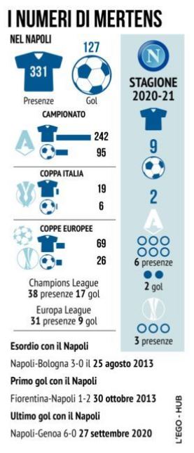 Mertens dopo quella rete nel primo match del campionato a Parma ne ha segnata soltanto un’altra nel 6-0 al Genoa, partita che si giocò il 27 settembre e non è riuscito a far centro neanche in Europa League: a digiuno da quasi due mesi, un fatto decisamente inusuale per Dries, bomber del Napoli di tutti i tempi a quota 127 gol e che va a caccia di nuovi record in maglia azzurra. Anche Gattuso nel dopo partita di Bologna, match vinto 1-0 con la rete di Osimhen e in cui il belga non sfruttò al meglio due opportunità dalla sua posizione preferita, sottolineò che in zona gol mancavano i gol di Mertens. Il ritorno da prima punta potrebbe agevolarlo consentendogli di giocare più vicino alla porta. Fonte: Il Mattino