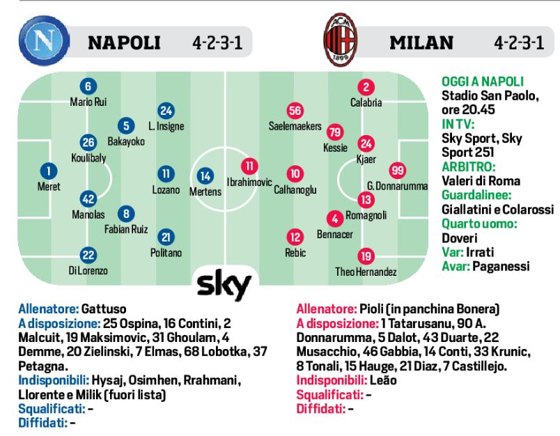 Questa sera allo stadio San Paolo, fischio d’inizio alle ore 20,45, il Napoli affronterà il Milan nel big-match per il vertice valevole per l’ottava di campionato. Diverse le assenze per gli azzurri, come i “positivi” al Covid-19 Rrahamani e Hysaj e l’infortunato Osimhen. Recupero invece di Ospina e Bakayoko, ma la novità è che Lozano sarà trequartista alle spalle di Mertens. Per i rossoneri out Rafael Leao, ma recupera in difesa Romagnoli. Per il resto sarà 4-2-3-1 per Bonera che prenderà il posto di Pioli colpito dal Covid-19.