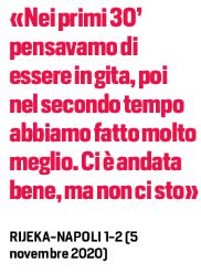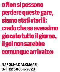 La sconfitta contro il Milan non è stata gradita da mister Gattuso, anzi a fine gara non le ha mandate a dire alla squadra. Non ha visto cattiveria, veleno e quella sana voglia di lottare su ogni palla. Non è la prima volta da quando il mister è seduto sulla panchina azzurra. Parole dure anche dopo la Fiorentina persa 0-1, con l’Az Alkmaar 0-1 e la mezz’ora contro il Rijeka. Si sentono in lontananza gli echi dell’ammutinamento successo lo scorso anno a fine gara contro il Salisburgo, perciò se ne sono dette negli spogliatoi. Il tutto augurandosi che l’S.O.S. venga ascoltato dal presidente De Laurentiis e dal d.s. Giuntoli per non restare soli in un momento non semplice. Il Napoli ha ricominciato a farsi del male da solo, si teme che il tutto possa sfuggire di mano e se Gattuso dovesse sfuggire la situazione allora scatterebbero gli allarmi. Serve una svolta e in tempi brevi.