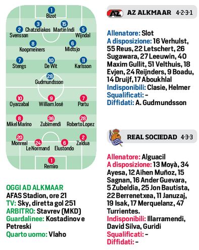 Questa sera all’Afas Stadium, fischio d’inizio alle ore 21,00, l’Az Alkmaar affronterà la Real Sociedad, in uno scontro al vertice per la fase a gironi di Europa League. Gli olandesi cercano il riscatto dopo la sconfitta dell’andata in terra basca. Dal primo minuto in campo il talentuoso Karlsson e la punta Gudmundsson, in panchina torna Boadu. Gli spagnoli dovranno fare a meno di David Silva, tutto sulle spalle di Oyarzabal, William Josè e Portu