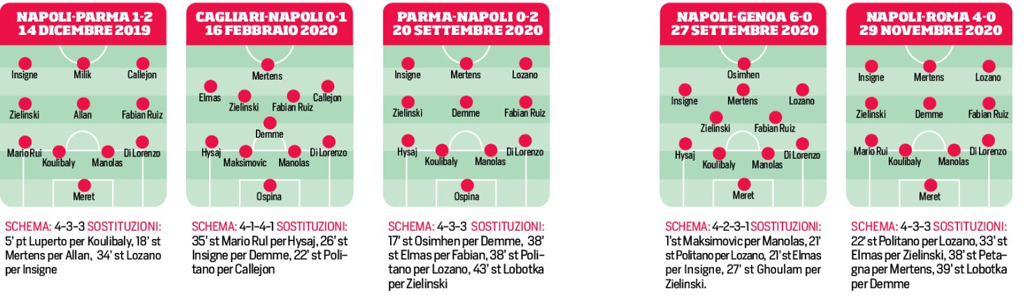 In un anno che Gattuso è seduto sulla panchina del Napoli, la situazione ambientale è cambiata, dall’ammutinamento, alla lotta per i primi posti in questo inizio di stagione. Il modulo è sempre lo stesso 4-3-3, ma con diverse novità tattiche. Domenica contro la Roma Zielinski ad esempio ha giocato tra il centrocampo e la trequarti, dando pochi punti di riferimento. L’elemento chiave è stato Demme che ha dato una mano davanti alla difesa. I tre là davanti hanno fatto il resto per fare giocate e portare a casa l’intera posta in palio. Il modulo però resta sempre il 4-2-3-1 ma cambia a seconda delle gare, insomma una squadra camaleontica.