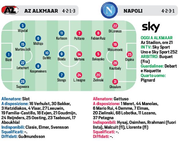 Questa sera all’AFAS Stadion di Alkmaar, l’Az di mister Arne Slot cercherà di bissare il successo dell’andata contro il Napoli tra le mura amiche. Per gli olandesi mancheranno Svensson, Clasie ed Elmer, ma sarà una formazione spregiudicata con il 4-2-1-3. De Wit alle spalle di Stengs, Boadu e Karlsson. In casa azzurra invece sarà 4-3-3 con le novità di Ospina in porta, Maksimovic al centro e a sinistra Ghoulam. A centrocampo ritornerà Bakayoko, squalificato contro la Roma. In attacco l’unica novità è Politano al posto di Lozano.
