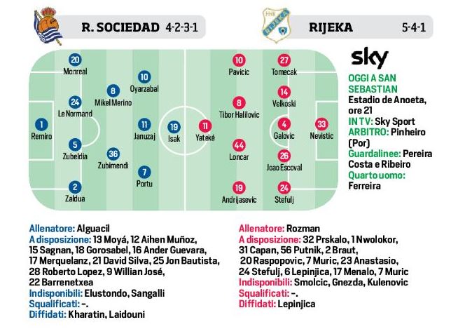Questa sera allo stadio Anoeta la Real Sociedad affronterà il Rijeka per conquistare il successo, ma con un orecchio alla radiolina per la sfida tra l’Az Alkmaar e il Napoli. I baschi recuperano David Silva, ma partirà dalla panchina. In attacco spazio ai vari Portu, Oyarzabal e Januzaj, dietro a Isak. La squadra croata invece dovranno fare a meno di Kulenovic, ma recupera dal Covid-19 Menalo. Il modulo sarà 5-4-1, difendersi bene e cercare ripartenze, la stessa tattica di Napoli.