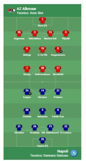 I due capitani: per l’Az Alkmaar, maglia rossa, il centrocampista Koopmeiners, per il Napoli, casacca azzurra, Lorenzo Insigne