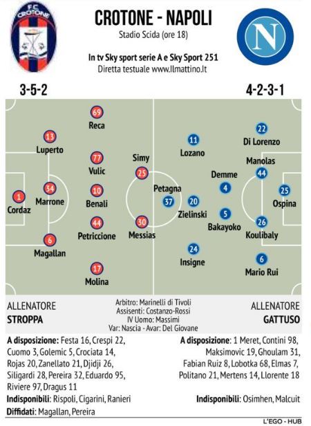 Crotone/Napoli: ecco le formazioni. Per Gattuso è una partita trappola, insidiosa, difficile