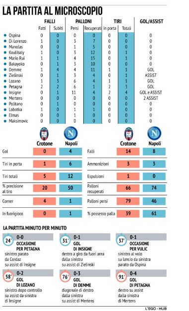 Netto il divario rispetto al Crotone, ultimo in classifica, che prova a restare in partita anche dopo il gol di Insigne ma poi sprofonda quando resta in inferiorità numerica al quinto del secondo tempo e incassa altri tre gol.