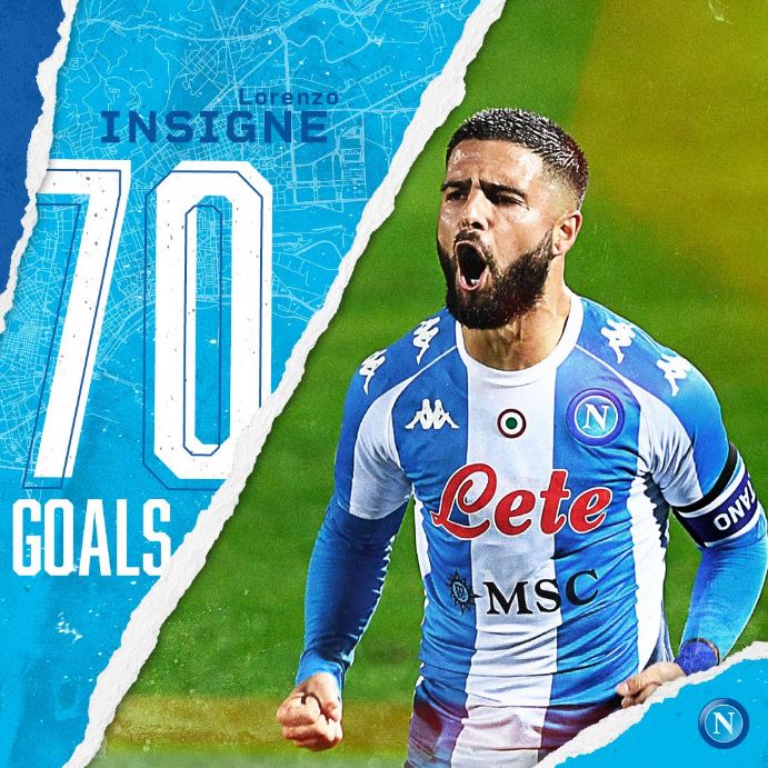 Lorenzo Insigne ha segnato 70 gol in Serie A con la maglia del Napoli, diventando il decimo giocatore di sempre del club per numero di reti nel massimo campionato (a -1 da Higuain e Altafini).