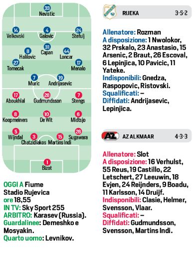 Questa sera alle ore 18,55 i padroni di casa del Rijeka, cercheranno un altro risultato di prestigio, dopo il pareggio contro la Real Sociedad, contro l’Az Alkmaar. I croati giocheranno con il 3-5-2, dove punteranno tutto su Muric, Loncar, Menalo e Andrijasevic. Gli olandesi, reduci dalla sconfitta in campionato contro il Groningen, invece schiereranno il 4-3-3 dove Aboukhal, Gudmunsson e Stengs dovranno fare la differenza in zona gol. Ovviamente occhio al risultato di Napoli-Real Sociedad, dove l’Az tiferanno per gli azzurri di Gattuso.