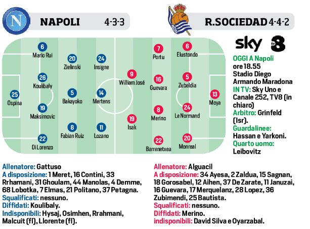 Questa sera alle ore 18,55, allo stadio Diego Armando Maradona, il Napoli cercherà di strappare il pass per il passaggio del turno di Europa League contro la Real Sociedad. Può pareggiare o vincere la gara per essere certo di centrare l’obiettivo. Mister Gennaro Gattuso, manderà in campo la migliore formazione possibile, con la sola novità di Maksimovic difensore centrale al posto di Manolas. A centrocampo rientrerà Fabian Ruiz, lasciato a riposo a Crotone, giocherà assieme a Bakayoko e Zielinski. In attacco Lozano, Mertens e Insigne. I baschi invece dovranno fare a meno di Oryazabal e David Silva infortunati e del lungodegente Irralamendi. Elustondo giocherà da terzino, in attacco spazio al duo Isak e Willima Josè.