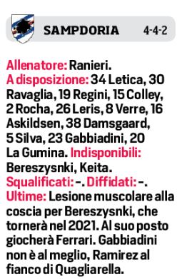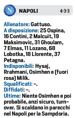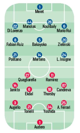 Oggi il Napoli riprenderà gli allenamenti in vista della sfida di domenica 13 Dicembre alle ore 15,00 allo stadio Diego Armando Maradona contro la Sampdoria dei numerosi ex. Per mister Gattuso, non è da escludere un po’ di turnover, dove sono pronti i vari Meret, Manolas, Ghoulam e Politano. In casa ligure certa le assenze di Bereszysnki e Keità, mentre è in dubbio Gabbiadini. In attacco spazio a Quagliarella e Ramirez, mentre in difesa Tonelli e Yoshida, con Augello e Ferrari sugli esterni.