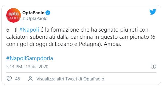 Sei gol dalla panchina, come nessuno in Serie A. Il Napoli ringrazia la rosa lunga a disposizione e si coccola oggi Lozano e Petagna, i due che hanno cambiato il volto della partita contro la Sampdoria.