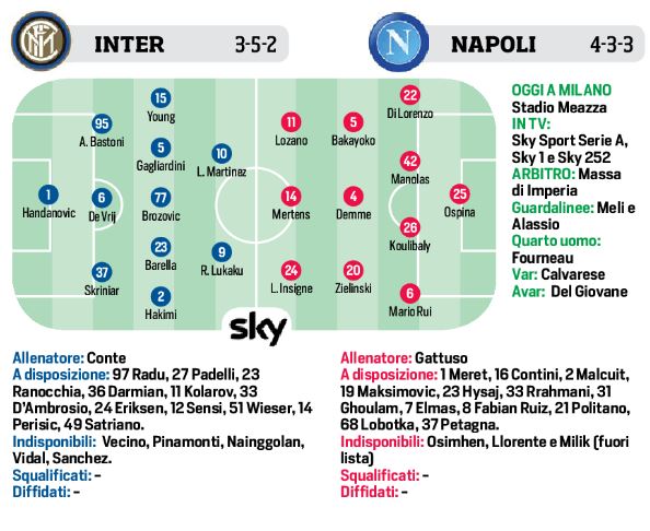 [Formazioni] Inter-Napoli, Conte recupera Hakimi. Gattuso punta su Mario Rui e Demme
